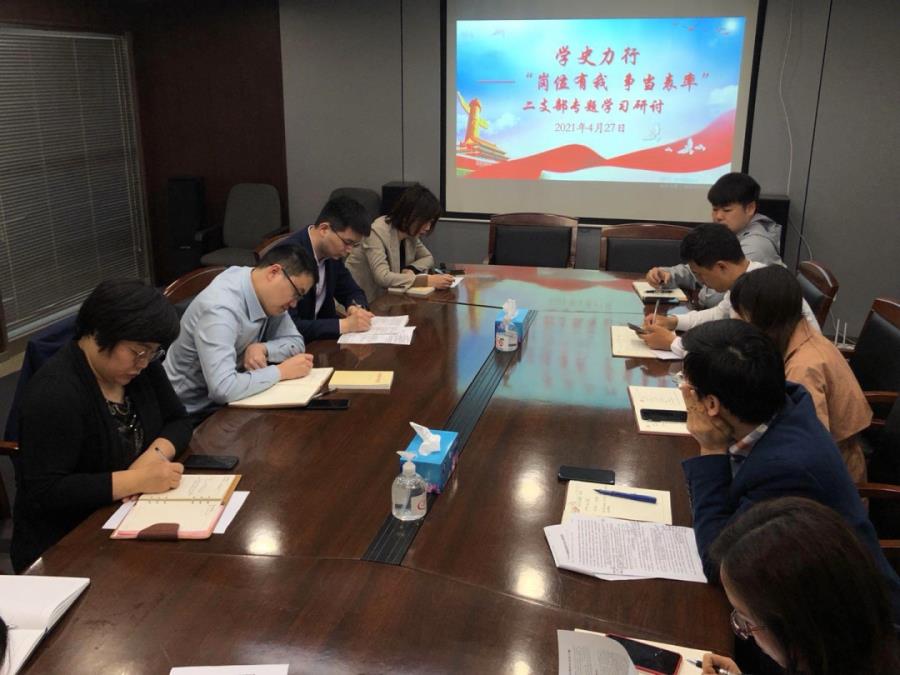 4月27日上午,公司第二支部召开学史力行——“岗位有我 争当表率”专题学习研讨,指出,习近平总书记的重要讲话,为开展好党史学习教育指明了方向、提供了遵循。要深入学思践悟,精准对标对表,进一步增强斗争精神。要初心如磐、使命担当,自身做表率,发挥埋头苦干的精神,把党史学习教育与自身岗位结合起来,切实把学习成效转化为提高工作效率、把控风险和推动公司业务高质量创新发展的实践成效,为实现集团“两高”定位贡献力量。
