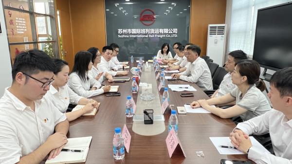 严淋彬对盛亚坤一行的到访表示欢迎,并详细介绍了苏州班列公司业务发展情况。严淋彬表示,苏州班列公司将充分发挥通道优势,切实将政策优势转化为经济效益和社会效益,希望双方以党建共建为引领强化业务协同,深化运贸一体化发展,实现双方优势互补,逐步形成全方位、多元化的“运输+贸易”业务体系。