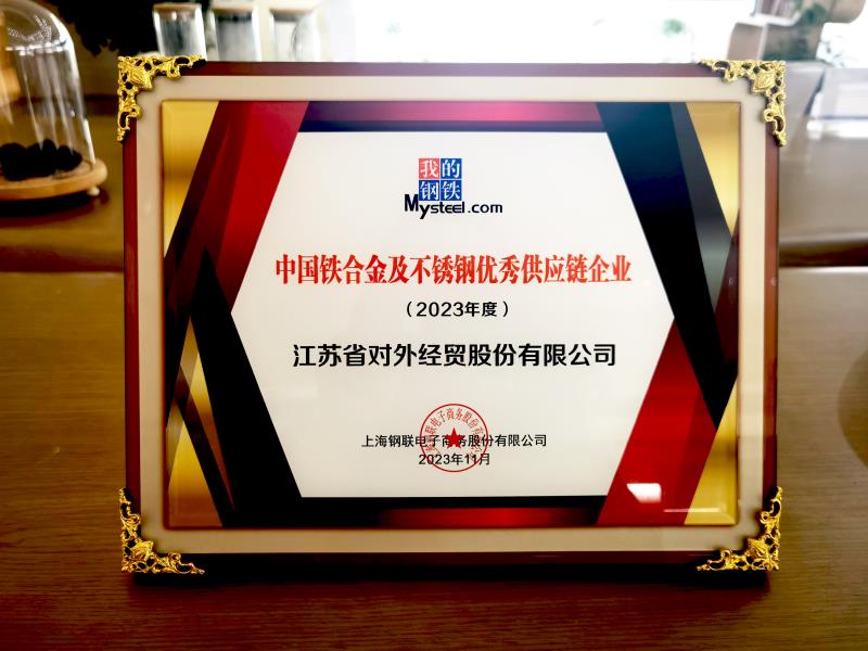 2023年11月15日,2024年国际铁合金及不锈钢产业年会在南京隆重召开,江苏外贸公司受邀参加了此次年会,并荣获“中国铁合金和不锈钢优秀供应链企业”称号。