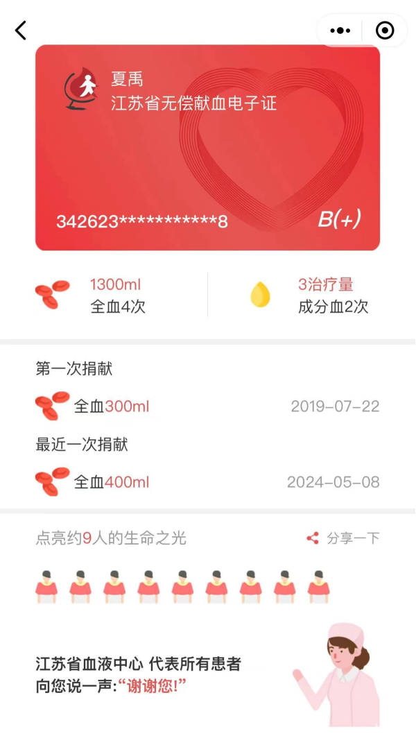 虽是“00后”,他的献血经历却“不容小觑”:成分血捐献2次、全血捐献4次,献血足迹图上赫然显示着已点亮约9人的生命之光。