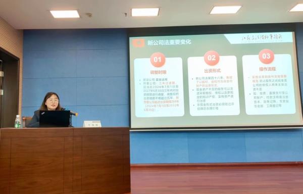 2023年12月29日,十四届全国人大常委会第七次会议修订通过《中华人民共和国公司法》,自2024年7月1日起施行。以新《公司法》即将全面实施为契机,为进一步提升企业风险管理水平,2024年5月27日,外贸公司协助苏豪控股集团举办风控法务大讲堂,邀请江苏三法律师事务所合伙人李珊珊律师作主题为《新公司法重要变化》的专题讲授。本次大讲堂由外贸公司总法律顾问、法审合规部总经理陈其南主持。